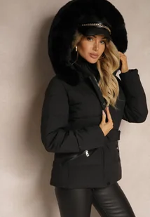 Czarna Zimowa Kurtka Pikowana z Kapturem z Futrem i Kieszeniami Salianna