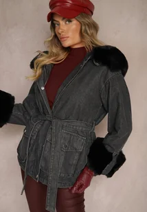Czarno-Szara Jeansowa Kurtka z Odpinanym Futerkiem i Kapturem z Dodatkowym Paskiem Tarwena
