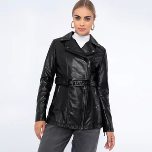 Damska kurtka skórzana. Ta stylowa damska kurtka przyciągnie niejedno spojrzenie. Asymetryczny suwak, wyjmowany kołnierz i połyskujące zatrzaski charakterystyczne dla ramoneski, występują w wyjątkowym, przedłużonym fasonie sięgającym do bioder lub za biodra. Talię podkreśla pasek, który jest wyjmowany, więc możesz go nosić jak lubisz. Ten model został wykonany z wysokiej jakości skóry naturalnej, bardzo przyjemnej w dotyku.