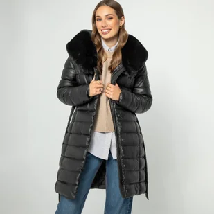 Długa pikowana kurtka z futerkowym kapturem Ta wyjątkowa kurtka damska wykonana ze skóry ekologicznej, łączy w sobie elegancję i praktyczność. Wyróżnia ją futrzany kaptur, który nie tylko dodaje szyku, ale także zapewnia dodatkowe ciepło. Kaptur jest nieodpinany, co gwarantuje, że zawsze będziesz wyglądać stylowo. Dla kogo? Doskonała dla kobiet, które cenią sobie modę i wygodę. Idealna dla pań w każdym wieku, które chcą wyglądać elegancko i stylowo, niezależnie od warunków pogodowych.