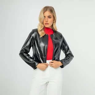 Elegancka krótka kurtka z ekoskóry Odkryj nową definicję stylu i komfortu z tą damską kurtką ze skóry ekologicznej. Ta odzież wierzchnia to doskonałe połączenie klasyki i nowoczesności, które z łatwością wpisuje się w każdą garderobę. Bez względu na to, czy wybierasz się na spotkanie, czy spacer po mieście, z tą zawsze będziesz prezentować się stylowo i czuć się komfortowo. Minimalistyczne wykończenie bez kieszeni i subtelne detale nadają nowoczesny charakter, podkreślając prostotę i elegancję. Dla kogo? Kurtka została stworzona dla kobiet, które cenią sobie nowoczesny design i uniwersalność.
