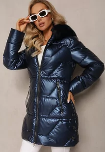 Granatowa Kurtka Pikowana z Futerkiem i Kapturem Asmina