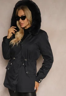 Granatowa Kurtka Typu Parka z Kapturem i Futerkiem z Możliwością Odpięcia Marindria