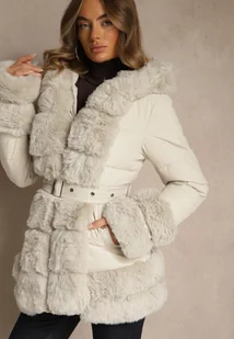Jasnobeżowa Taliowana Kurtka z Paskiem Kapturem i Ozdobnym Futrem Rainaria