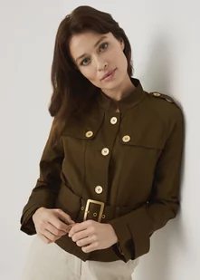 Krótka kurtka damska, wykonana z tkaniny poliestrowej. Połączenie tabakowego brązu ze złotym kolorem metalowych dodatków prezentuje się niezwykle efektownie i luksusowo. Model posiada możliwość regulacji talii za pomocą troczków (wewnątrz) oraz paska. Kurtka w takiej formie daje szerokie możliwości kreowania ciekawych wariantów, tworząc doskonały i niepowtarzalny wygląd. kolor tabakowy brąz prosta, krótka forma model ze stójką zapięcie na guziki brak kieszeni możliwość regulacji talii za pomocą troczków oraz paska kontrastowa podszewka elementy metalowe w kolorze szczotkowanego złota długość okolice bioder Skład: