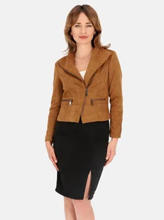 Krótka kurtka damska ze sztucznego zamszu na suwak Krótka ciemnobeżowa kurtka damska ze sztucznego zamszu na suwak to idealny wybór na cieplejszą porę roku. ...