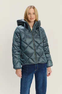 Turkusowa kurtka o krótkim kroju. Model z praktycznym kapturem i pojemnymi