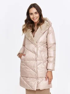 Kurtka damska Top Secret z niebywale ciepłym misiem wewnątrz. Urzekająca komfortem podczas użytkowania oraz niebagatelnym designem dłuższa kurtka damska z prostymi długimi rękawami zakończonymi chowanym ściągaczem. Posiada ona praktyczne kieszenie po bokach i jest zapinana z przodu na duże zatrzaski, a uroku dodają jej efektowne pikowania na całości. Posiada ona ciepłego misia wewnątrz oraz ma okazały kaptur. Gruba ciepła kurtka jest świetnym pomysłem na efektowną stylizację w okresie jesiennym czy też zimowym, stanowiąc skuteczną ochronę przed deszczem, śniegiem czy też wiatrem. Kurtka damska dostępna w kolorze beżowym TSKW24KUR143780X00. Modelka ma 176 cm wzrostu i prezentuje rozmiar 34.