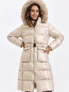 Kurtka damska Top Secret z efektownym marszczonym paskiem. Ceniona za swój niebagatelny design długa kurtka damska z prostymi długimi rękawami zakończonymi chowanym ściągaczem. Posiada ona okazały kaptur wraz z ciepłym futerkiem wokół jego brzegów i jest zapinana z przodu na dwa praktyczne suwaki. Wykonana ona została z ciepłej oraz przyjemnej w dotyku dzianiny, ujmując swym metalicznym połyskiem oraz efektownym pikowaniem. Posiada ona duże naszyte kieszenie wraz z patkami u dołu po bokach, a w talii ma pasek wraz z klamrą z tego samego materiału, marszczony na całości. Stanowi ona doskonałą ochronę przed zimnem, wiatrem czy też śniegiem. Kurtka damska dostępna w kolorze beżowym TSKW24KUR143080X00. Modelka ma 177 cm wzrostu i prezentuje rozmiar 34.