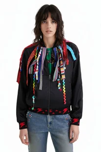 Kurtka damska Desigual Tree bomberka z tasiemkami Nr. katalogowy: 22SWEW61/2000 Pierwotna cena katalogowa: 819. 00 zł Wyrazista, czarna bomberka damska w satynowej tkaninie, ozdobiona kolorowymi tasiemkami i detalami, które nadają jej ekstrawagancki, festiwalowy charakter. Idealna dla miłośniczek fashion i streetwearu, które lubią przyciągać wzrok.
