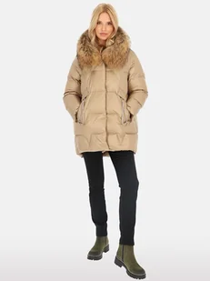 Kurtka damska puchowa długości ¾ z futrem jenota Beżowy XXL