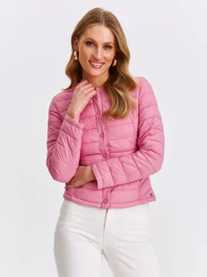 Kurtka dostępna w kolorze różowym SKU1421RO. Modelka ma 177 cm wzrostu i prezentuje rozmiar 34.