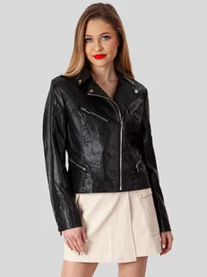 Kurtka damska, krótka, czarna typu ramoneska. Wykonana z miękkiej skóry ekologicznej. Zapinana na metalowy suwak. Posiada liczne dekoracyjne cięcia i przeszy...