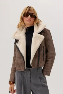 Pilotka Clip z futrzaną podszewką to doskonały wybór na chłodniejsze dni — jej otulający, miękki kołnierz wykończony futrem nie tylko przyciąga spojrzenia, ale zapewnia poczucie komfortu i ciepła. Wierzchnia część powstała z delikatnej, wełnianej tkaniny o drobnym wzorze kraty, która nadaje całości klasy i niepowtarzalnego uroku. Subtelnie opadające ramiona, lekko oversize'owy krój oraz starannie dopracowane detale, tworzą harmonijny balans pomiędzy wygodą a wyrazistym stylem. Wierzch z wysokogatunkowej wełnianej tkaniny w kratę Tułów kurtki oraz kołnierz wykończone miękkim, przyjemnym futerkiem Rękawy wypełnione ociepliną, wykończone podszewką Lekko opuszczone ramiona Przednie kieszenie z zamkami i listewkami z ekologicznej skóry Asymetryczne zapięcie na metalowy zamek błyskawiczny, Długość kurtki (środkiem tyłu) 48 cm Skład: Tkanina: 80% wełna 20% poliester ; Futro: