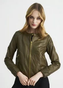 Damska kurtka w kolorze khaki. Uszyta z miękkiej, naturalnej skóry owczej typu Nappa. Lekko zbluzowana, niedopasowana forma, delikatne skórzane ściągacze sprawiają, że model nieco przypomina popularne kurtki „bomberki” chętnie noszone na co dzień do niezobowiązujących stylizacji. kolor khaki naturalna skóra owcza Nappa model nieocieplany dekolt typu round-neck z ozdobnym zapięciem zapięcie na suwak dwie zewnętrzne kieszenie na suwak skórzane ściągacze elementy metalowe w kolorze jasnego złota długość sięgająca bioder Skład: skóra naturalna owcza Podszewka: