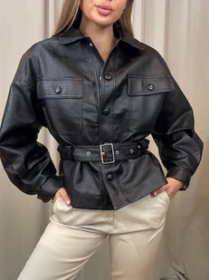 Kurtka z ekoskóry z paskiem. Występuje w innych kolorach. Rozmiar uniwersalny. Włoska produkcja. Wymiary: Biust 110cm Długość 60cm Skład: 68,8% poliuretan 28,3% poliester 1,6% wiskoza 1,3% bawełna 100% po ...