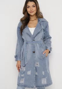 Niebieska Długa Kurtka Jeansowa Płaszcz Denimowy z Przetarciami i Wiązanym Paskiem Arinvi