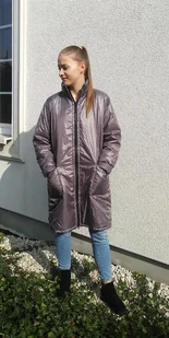 Ocieplana długa kurtka-płaszczyk ze stójką w kolorze kamiennym zapinana na suwak Nabłyszczana - impregnowana. W środku ocieplacz poliestrowy. Bardzo lekka Wymiary: ramiona: 84 cm, biust: 122 cm, biodr ...