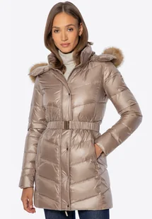 Materiał: Wykonana z nylonu, który skutecznie chroni przed wiatrem i sprawdza się w codziennym użytkowaniu. Ochrona termiczna: Naturalne wypełnienie z puchu kaczego i pierza zapewnia wyjątkowe ciepło nawet w mroźne dni, zachowując przy tym lekkość i komfort noszenia. Pasek w talii: Akcentuje kobiecą figurę i dodaje kurtce modnego charakteru.