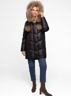 Ciepła, wygodna, praktyczna, czarna kurtka damska o prostym kroju ozdobiona pikowaniem, okazałym futrem z jenota i futrzanymi pomponami wyróżni cię i sprawdz...
