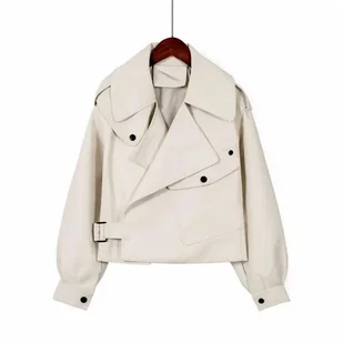 Skórzana kurtka damska z kieszonką po boku - Beżowy L