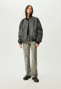 Kurtka typu bomber wykonana z tkaniny z efektem sprania. Stójka i długi rękaw zakończony elastycznym ściągaczem. Wpuszczane kieszenie z przodu. Detale wykończone kontrastującą dzianiną ściągaczową. Zapięcie z przodu na metalowy zamek błyskawiczny i ukryte napy pod listwą.