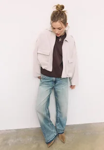 Kurtka wykonana z tkaniny imitującej sztuczny zamsz. Fason balonowy z kołnierzem z klapami. Długi rękaw i dół wykończony elastyczną gumką. Z przodu naszyte kieszenie. Zapięcie na suwak z przodu.