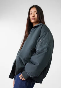 Bomberka z wysokim kołnierzem, długim rękawem z mankietami, kieszeniami z klapami z przodu na zatrzaski, kieszenią na suwak na rękawie i ściągaczami pod kolor. Zapinana na metalowy suwak z przodu.