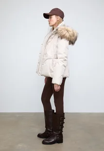 Pikowana kurtka z wysokim kołnierzem i Kapturem z odpinanym sztuczne futro. Długi rękaw zakończony mankietem z otworem na kciuk typu mitenki. Przednie kieszenie zapinane na guzik z podszewką polarową. Regulowane szlufki z guzikami w talii. Wewnętrzna podszewka z tkaniny połączonej ze sztuczne futro.