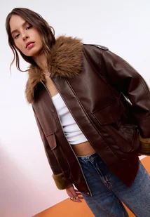 Kurtka uszyta z tkaniny imitującej skórę. Kołnierz z klapami z odpinanym na guziki detalem z tkaniny imitującej futro. Długi rękaw wykończony mankietem z patką na ramieniu. Naszyte kieszenie z klapą z przodu i wpuszczane kieszenie po bokach na ręce. Elastyczne wykończenie dołu.