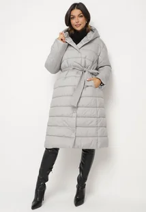 Szara Pikowana Kurtka z Kapturem Wiązanym Paskiem i Zapięciem na Napy Tilinia