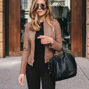 Taliowana kurtka damska ramoneska ze skóry ekologicznej - Beżowy