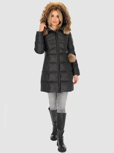 Taliowana puchowa kurtka damska przed kolano z futrem jenota L Czarny