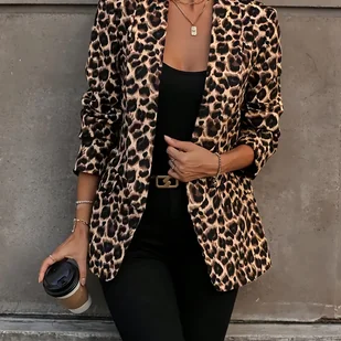 TEMU Damska Kurtka z Kołnierzykiem w Lamparcie Wzory, Bez Guzików i Długim Rękawem