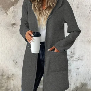 TEMU Damska swobodna długa kurtka z kapturem i zamkiem błyskawicznym - jednokolorowa odzież zewnętrzna o średniej długości, regularny krój, niezbędny