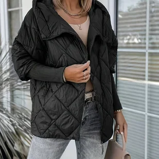 TEMU Damski Elegancki Ciepły Płaszcz Zimowy z Kapturem, Modna Kurtka Zimowa z Kieszeniami na Zamek, Batwing Rękawy, Jednokolorowa, Quiltowana,