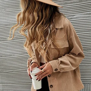 TEMU Elegancka Beżowa Kurtka-Koszula z Guzikami dla Kobiet - Szykowny Długi Rękaw, Poliester, Nieprześwitująca z Kołnierzem - Idealna na Wiosnę i
