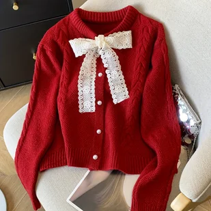 TEMU Damski Nowy Jesienno/Zimowy Elegancki Czerwony Kardigan, Koronkowy Kokardowy Design z Białymi Perłowymi Guzikami, Elegancki Sweter na