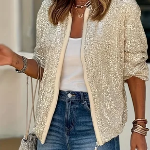 TEMU Kobieca Elegancka Kurtka z Cekinami na Zamek - Długi Rękaw, Okrągły Dekolt, Czarna z Złotymi Akcentami, Idealna na Jesień/Zimę, Od Casualu do
