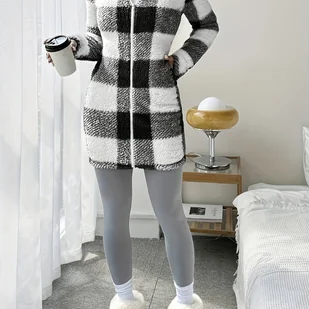 TEMU Kurtka z kapturem w kratę z polaru, zapinana na zamek, z długim rękawem i długością do połowy łydki