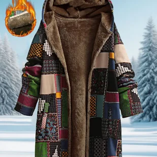 TEMU Kobieca Przytulna Kurtka z Kapturem i Podszewką Polarową - Geometryczny Wzór, Średniej Długości, Z Kieszeniami, Brązowo-Wielokolorowa, Casualowy