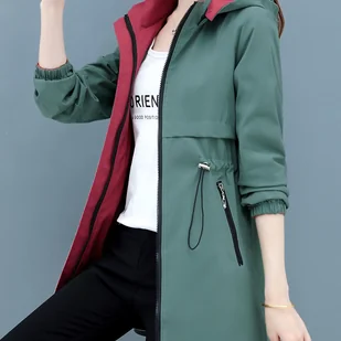 TEMU Kurtka Damska Dwukolorowa Czerwono-Oliwkowo-Zielona – Lekki Wiatroszczelny Płaszcz z Kapturem, Materiał Nierozciągliwy, Zamek Błyskawiczny i