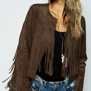 TEMU Wiosenna i Jesienna Damska Elegancka Kurtka Casual z Frędzlami, Jednokolorowa, Lekka, Długi Rękaw, Retro Styl Zachodni, Idealna na Wyjścia,