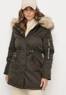 Zielono-Beżowa Kurtka Parka z Futerkowym Odpinanym Zdobieniem przy Kapturze Inellae