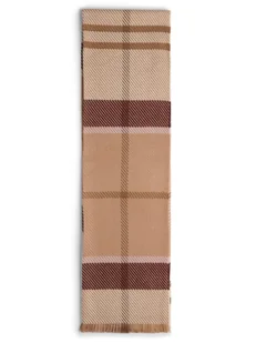 Szal w kratę beżowo-różową z frędzlami 40x190 cm
