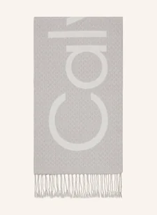 Lekki materiał. Z domieszką wełny. Nadruk z logo. Tkany materiał. Krótkie frędzle na zakończeniach
