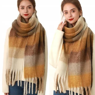 Duży Ciepły Szal Gruby Elegancki Szalik Damski W Kratę Modny Chusta Kolor Beż