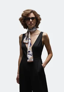 * Stylowy szal jedwabny o wymiarach 16 cm x 145 cm, idealny do codziennych i eleganckich stylizacji. * Beżowe tło z granatowym, artystycznym wzorem przypominającym malarskie pociągnięcia dodaje char ...