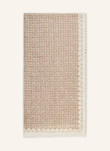 Tkany materiał. Z wełny. Wzór graficzny. Delikatne frędzle na zakończeniach. Tkany materiał