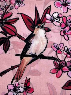 KOMIN (szeroki i b. ciepły) autorski print w SŁOWIKI i różowe kwiaty na pastelowym tle (bawełna)